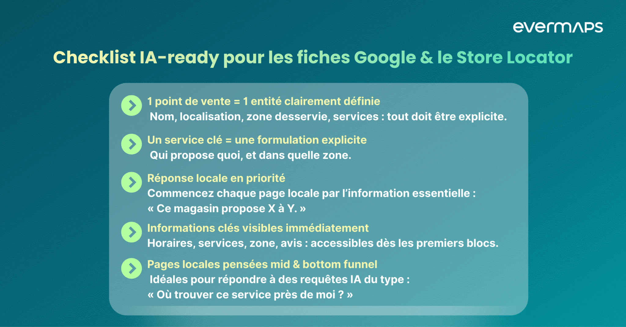 Chez Evermaps, nous transformons les recommandations génériques confirmée par l’étude HubSpot en actions concrètes pour optimiser la visibilité des enseignes multi-points de vente.