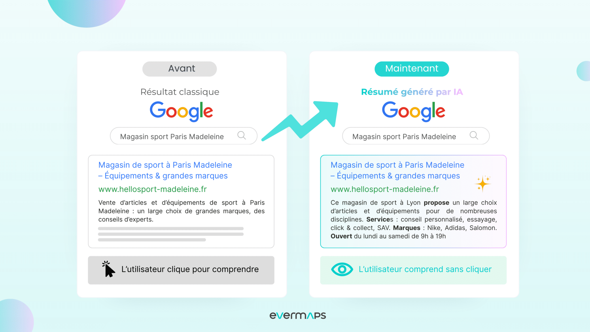 Google interprète et restitue directement les éléments clés : services, offres, horaires. Si vos contenus sont mal structurés, l’IA reconstruit l’information à votre place.